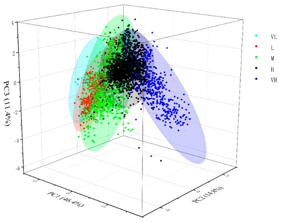 Principal component analysis score plot. VL indicates the sample points with very low sensitivity to desertification; L indicates the sample points with low sensitivity to desertification; M indicates the sample points with medium sensitivity to desertification; H indicates the sample points with high sensitivity to desertification; VH indicates the sample points with very high sensitivity to desertification.