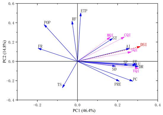 Plot of principal component analysis loadings. DSI, desertification sensitivity index; SQI, soil quality index; VQI, vegetation quality index; CQI, climate quality index; MQI, management quality index; TS, terrain slope; SP, soil pH; SD, soil depth; RF, rock fragments; ST, soil texture; FR, fire risk; DR, drought resistance; EP, erosion protection; PC, plant cover; AI, aridity index; PRE, precipitation; ETP, evapotranspiration; POP, population density; LU, land use.