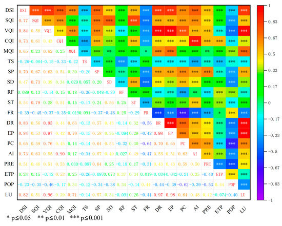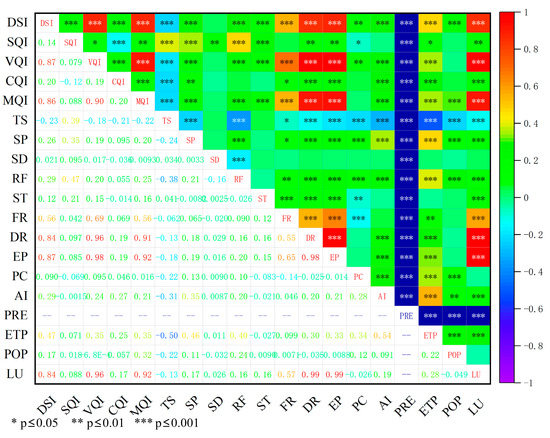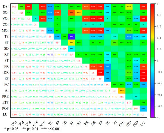 Heat map of desertification correlation in region A in Figure 12. DSI, desertification sensitivity index; SQI, soil quality index; VQI, vegetation quality index; CQI, climate quality index; MQI, management quality index; TS, terrain slope; SP, soil pH; SD, soil depth; RF, rock fragments; ST, soil texture; FR, fire risk; DR, drought resistance; EP, erosion protection; PC, plant cover; AI, aridity index; PRE, precipitation; ETP, evapotranspiration; POP, population density; LU, land use. p < 0.05 is a slightly significant correlation; p < 0.01 is a significant correlation; p < 0.001 is a very significant correlation.