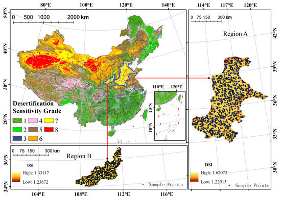 - Xu, D.; You, X.; Xia, C. Assessing the spatial-temporal pattern and evolution of areas sensitive to land desertification in North China. Ecol. Indic. 2019, 97, 150–158. [Google Scholar] [CrossRef]