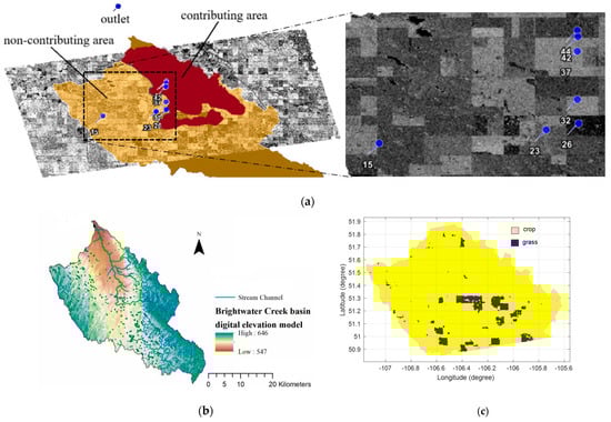 The Brightwater Creek (BWC) watershed is located within the south river basin of Central Saskatchewan in Canada and a semi-arid region (mean annual precipitation: approximately 330 mm during 2009–2014) []. The mean air temperature is approximately 18–20 °C in July. As shown in Figure 1a, several soil moisture local stations are available in this region to validate and calibrate various hydrological research activities, including research associated with the Changing Cold Regions Network (CCRN) [], in addition to satellite missions such as the European Space Agency (ESA)’s SMOS and the National Aeronautics and Space Administration (NASA)’s Soil Moisture Active Passive (SMAP) []. The locations of each station are presented in Table 1 and Figure 1a. The spatial domain in Figure 1a is set to include those stations, ranging from latitude 50.8029° to 51.9298° to longitude −107.1698° to −105.5573°. The contributing and noncontributing areas delineated in Figure 1a were obtained from the PFRA (Prairie Farm Rehabilitation Administration)-Agriculture and Agri-Food Canada dataset, which was created by the flow network to track the hydrometric gauging station’s upstream and downstream neighbors.