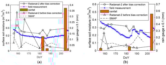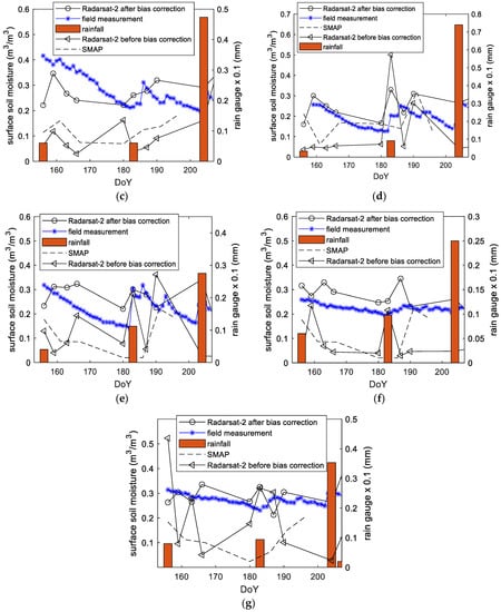 On the other hand, for Radarsat-2, such vegetation effects are considered to be mitigated by the bias corrections made in Section 2.3.3. Accordingly, it is speculated that the RMSEs or biases of Radarsat-2 were more likely to be related to backscattering measurement or calibration errors, low-resolution soil texture information [] or to resampling errors.