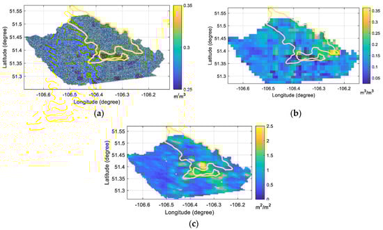 Spatial distribution on DoY 156: (a) Radarsat-2 soil moisture (m3/m3), (b) SMAP soil moisture (m3/m3) and (c) 500 m MODIS LAI on DoY 153. Contributing area is confined by the yellow line.