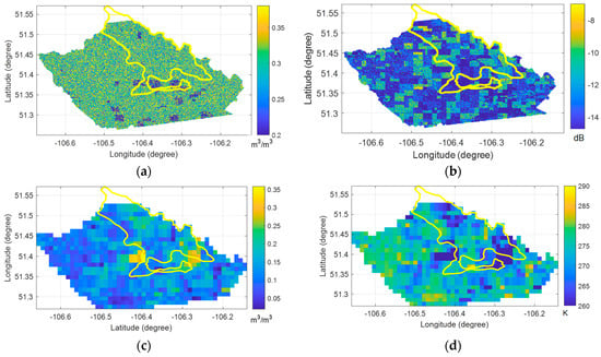 Spatial distribution on DoY190: (a) Radarsat-2 soil moisture (m3/m3), (b) Radarsat-2 backscatters, (c) SMAP soil moisture (m3/m3) and (d) SMAP brightness temperature. Contributing area is confined by the yellow line.