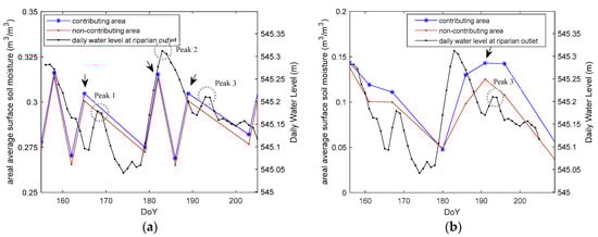 Areal averaged soil moisture over the contributing and noncontributing areas in comparison with the water levels at the riparian outlet: (a) Radarsat-2 and (b) SMAP.