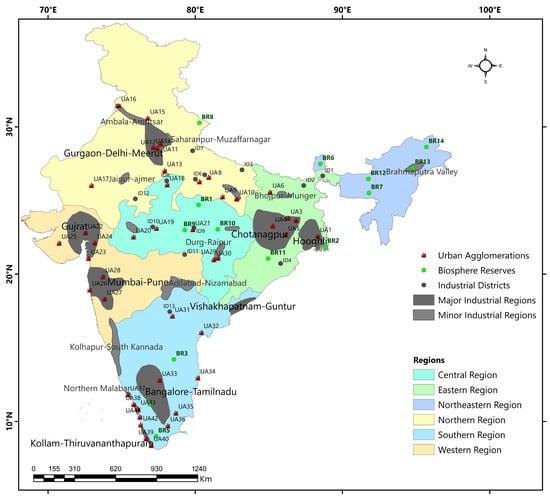 Urban agglomerations, (UA1) Kolkata, (UA2) Asansol, (UA3) Dhanbad, (UA4) Ranchi, (UA5) Jamshedpur, (UA6) Patna,(UA7) Lucknow, (UA8) Kanpur, (UA9) Allahabad, (UA10) Varanasi, (UA11) Meerut, (UA12) Ghaziabad, (UA13) Agra, (UA14) Delhi, (UA15) Chandigarh, (UA16) Amritsar, (UA17) Jodhpur, (UA18) Gwalior, (UA19) Bhopal, (UA20) Indore, (UA21) Jabalpur, (UA22) Ahmedabad, (UA23) Surat, (UA24) Vadodara, (UA25) Rajkot, (UA26) Mumbai, (UA27) Pune, (UA28) Nasik, (UA29) Raipur, (UA30) Durg_Bhilainagar, (UA31) Hyderabad, (UA32) Vijayawada, (UA33) Bangalore, (UA34) Chennai, (UA35) Coimbatore, (UA36) Madurai, (UA37) Kannur, (UA38) Kozhikode, (UA39) Kollam, (UA40) Thiruvananthapuram, (UA41) Thrissur, (UA42) Kochi, (UA43) Malappuram and industrial districts (ID1) Jalpaiguri, (ID2) Purnia, (ID3) Gorakhpur, (ID4) Cuttak, (ID5) Lucknow, (ID6) Kanpur, (ID7) Bareilly, (ID8) Gwalior, (ID9) Jabalpur, (ID10) Bhopal, (ID11) Nagpur, (ID12) Kota, (ID13) Hyderabadand biosphere reserves(BR1) Panna, (BR2) Sundarban, (BR3) Seshachalam, (BR4) Nilgiri, (BR5) Agasthyamalai, (BR6) Khanchendzonga, (BR7) Nokrek, (BR8) Nanda Devi, (BR9) Pachmarhi, (BR10) Achanakmar_Amarkantak, (BR11) Simlipal, (BR12) Manas, (BR13) Dibru_Saikhowa, (BR14) Dihang_Dibang in India.