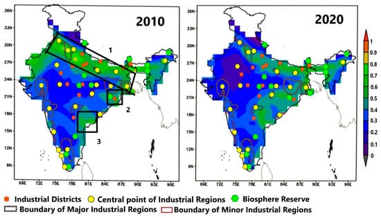 Locations of the selected central points of the industrial region, industrial districts, and biosphere reserve for aerosol optical depth (AOD) level analysis. Black boxes denote 1. Indo-Gangetic plain, 2. Utkal Plain, 3. Andhra Plain.