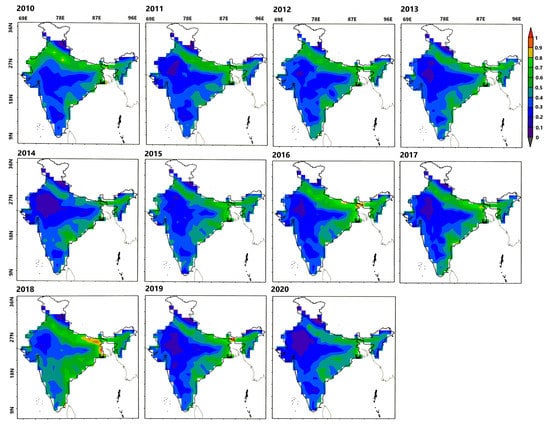 In Figure 3, the spatiotemporal variation of pre-monsoon AOD pixels indicates the changing AOD variation across the Indo-Gangetic region, Utkal, and the Andhra plain (greenish area except for the northeastern region). As the convergence zone shifts northward during the pre-monsoon season, the surface itself is also intensely heated, causing local convection associated with strong dust storms. These storms, mainly over north-western India, yield a great deal of soil and mineral dust into the atmosphere [43]. Based on the pixel values of time average maps of AOD, it is notable that the AOD levels vary over time and across different regions in the Indian subcontinent.