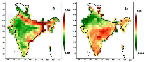 Similarly, in the upper southern part of India, the average pre-monsoon LST level of UAs and IDs (40.6 °C) was also higher than that of BRs (38.6 °C) in the same region. Forest-covered areas have lower LSTs relative to other land covers due to the combined effects of albedo, surface roughness, and thermal properties [55,56,57,58].