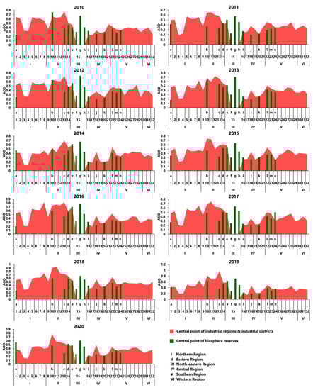 The AOD levels in the central area of the industrial regions and districts are generally higher than those in the nearest biosphere reserves, with the exception of the northeastern region (Figure 5). Specifically, in the Hooghli industrial region in the eastern part of the Indian subcontinent, the average pre-monsoon AOD level in the central point is 0.704, which is higher than the nearest biosphere reserve Sundarban (0.544), and the same feature is noted for the industrial district Cuttack (0.544) and the nearest biosphere reserve Simlipal (0.519).