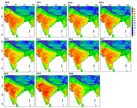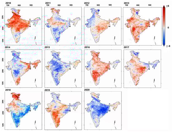 The time series maps of the LST anomaly (Figure 7) denote the increasing LST anomaly in 2010 and decreasing LST anomaly in the 2020 pre-monsoon season.