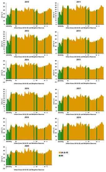 3.1.6. Year-Wise LST of Urban Agglomerations (UAs), Industrial Districts (IDs), and Biosphere Reserves (BRs)