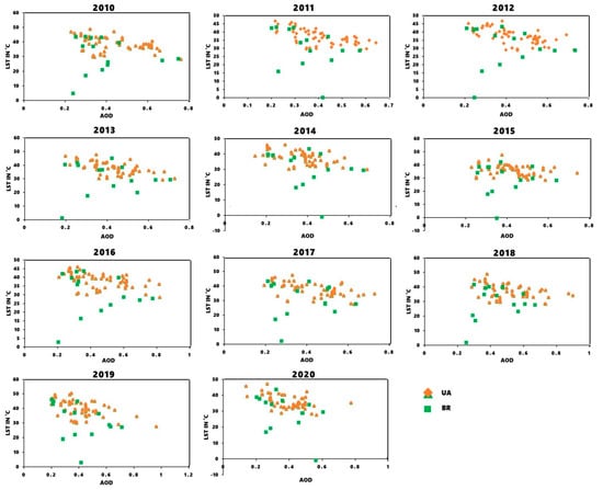 Scatter plot showing year_wise aerosol optical depth (AOD) and land surface temperature (LST) relationship in urban agglomerations (UAs) and biosphere reserves (BRs).