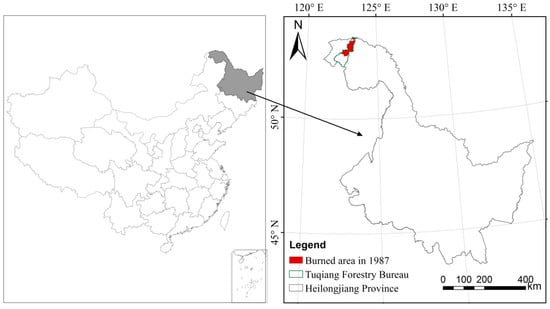The Tuqiang Forestry Bureau is located in Mohe County at the northern foot of the Greater Hinggan Mountains, bordering the Amur Forestry Bureau in the east, the Mangui Forestry Bureau of Inner Mongolia in the south, the Xilinji Forestry Bureau in the west, and faces Russia across Heilongjiang in the north. The geographical coordinates are 122°18′28″–123°28′10″E and 52°15′35″–53°33′42″N. The major mountain range in this area lies from northeast to southwest. The terrain is long and narrow and is high in the south and low in the north. The region is located in a cold temperate, continental monsoon climate zone, with long, cold winters and short, hot summers. The average annual precipitation is about 400 mm. The frost-free period is 80 to 90 days. The average annual temperature is −3.9 °C. The natural vegetation of this region is of the boreal coniferous type; major conifer species include Dahurian larch (Larix gmelinii) and Mongolian scotch pine (Pinus sylvestris), which both grow in pure and mixed stands. After a fire disturbance, these species are often replaced by northern hardwoods, including birch (Betula platyphylla) and aspen (Populus davidiana). On 6 May 1987, a devastating forest fire occurred in this area; large areas of natural forests managed by the Tuqiang Forestry Bureau were destroyed, leading to a substantial decline in forest resources. The burned area covered 2310 km2, and this accounted for more than 80% of the total forest area [35]. The “5·6 Fire” was the most severe fire since the founding of the People’s Republic of China, which destroyed one-fifth of the Greater Hinggan Mountains forest area (a burned area of 1.33 × 104 km2 and a burned forest area of 1.01 × 104 km2). More than 50,000 people became homeless as a result of the fire, and hundreds died; in addition, there was a direct economic loss of over CNY 500 million and an indirect economic loss of CNY 6 billion [36,37]. In this article, through the comparison of remote sensing images from 1986 and 1987 by visual interpretation, the post-fire region of the Tuqiang Forestry Bureau was selected as the study area (Figure 1).