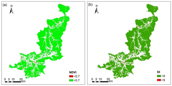 Spatial distribution of vegetation index: (a) NDVI (Normalized Difference Vegetation Index); (b) DI (Disturbance index) in 2011.