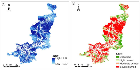 Burn severity mapping: (a) dNBR values; (b) different burn severities.