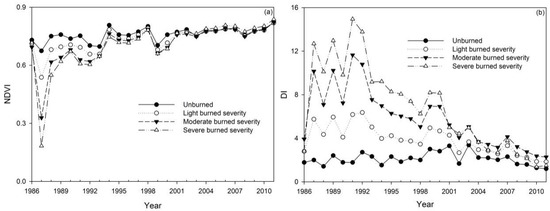 Yearly NDVI (a) and DI (b) trends with different burn severity classes.