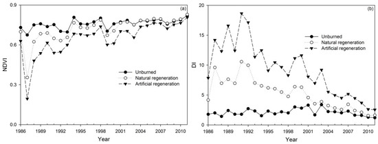 In essence, the different responses of the NDVI and DI to the forest’s post-fire regeneration process were due to their different abilities to respond to horizontal and vertical forest structure changes. There were differences between the NDVI and DI on the spectral response characteristic curves of non-vegetation cover, herbs, shrubs, trees, and their combinations. The NDVI quantifies vegetation coverage by using the difference between the strong reflection of vegetation leaves on the near-infrared band and the strong absorption of the red band, while there is basically no difference between the two bands in an area without vegetation cover. Therefore, the NDVI is very sensitive to changes in vegetation cover, especially under conditions of no vegetation cover or low vegetation cover. In 1987, a major portion of the forests, including herbs, shrubs, and trees, were burnt down. Large unvegetated or sparse vegetated areas appeared. The more severe the fire was, the larger the unvegetated or sparse vegetated areas and the lower the vegetation cover was. The NDVI value dropped dramatically. That is to say, the more serious the damage was, the lower the NDVI value was. Vegetation started to recover after the fire. Due to the soil seed banks of herbs and shrubs, these types of vegetation were least affected by the fire [53,54] and were more likely to rely on rhizoid germination [57]; herbs and shrubs preferentially recovered according to different fire damage degrees and recovery methods. Although trees recovered slowly under natural restoration conditions, the total vegetation coverage recovered quickly, and the NDVI value increased rapidly. Meanwhile, in the artificial restoration process, the selective felling of large-diameter trees could have affected the canopy density. However, the replanting of coniferous species such as Larix gmelini and Pinus sylvestris increased the vegetation coverage. Therefore, the total vegetation cover had little influence, and the NDVI increased quickly as well. Several years later, with the recovery of canopy density, the NDVI increased slowly. Because the NDVI uses nonlinear stretching to enhance the reflectance contrast of near-infrared and red light, it has low sensitivity to high vegetation-covered areas. Therefore, when forests were in the successional stage, from shrubs to trees, the vegetation coverage had already recovered, and there was little difference in the NDVI between various burn severities and restoration methods. This was also probably due to the fact that only two bands were used in the acquisition of the NDVI, making it relatively insensitive to post-fire forest recovery detection in the long time series [2].
