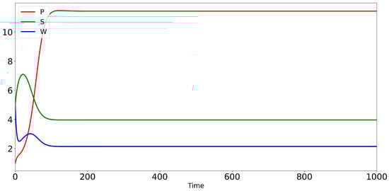 Equilibrium points of the vegetation dynamic model can be estimate by setting three equations in system (1) equal to 0 (, and ). The model has two types of equilibria: (1) one equilibrium has no vegetation (bare state: ); and (2) one equilibrium corresponds to strictly positive vegetation biomass (, , ). The dynamic of vegetation biomass, surface water and soil water is shown in Figure 1.