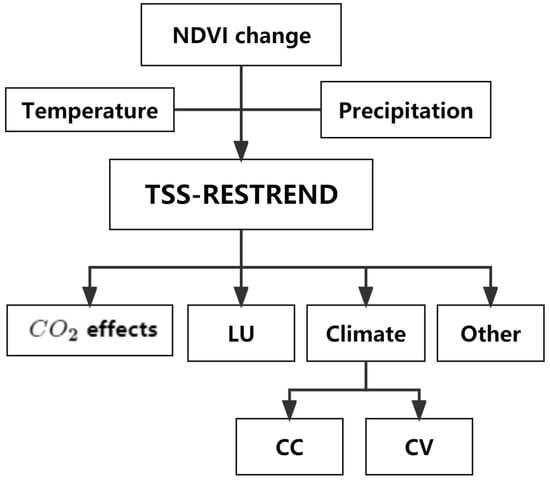 Climate variability and climate change are two related but distinct concepts in the field of climate science. Climate variability refers to the natural fluctuations in climate parameters such as temperature, precipitation, and wind patterns that occur over relatively short periods of time (typically months to years). These variations can be driven by various factors such as natural cycles in the Earth’s climate system, including El Niño and La Niña events, solar variability, and volcanic activity. Climate change, on the other hand, refers to long-term shifts in climate patterns, typically over decades to centuries, that result from changes in the Earth’s energy balance due to human activities, particularly the emission of greenhouse gases such as carbon dioxide. Climate change is often associated with rising global temperatures, shifts in precipitation patterns, and changes in the frequency and intensity of extreme weather events. In summary, climate variability refers to the natural, short-term fluctuations in climate, while climate change refers to long-term, human-induced changes in climate patterns. The climate effects are estimated from NDVI through TSS-RESTREND. Additionally, we need to separate the climate effects to climate change (CC, change with anthropogenic activities) and climate variability (CV, change without anthropogenic activities). We apply a 20-year leading edge moving window on observed per-pixel precipitation and temperature datasets to remove the interannual CV. So, it is necessary to use the dataset that dates back to 1960. The long-term trend calculated by the Theil–Sen slope estimate is CC. NDVI change due to CV is the detrend climatology. Other factors that cannot be attributed are defined as OF = Obs − (CO + CC + CV + LU). The flowchart of the methods is shown in Figure 3.