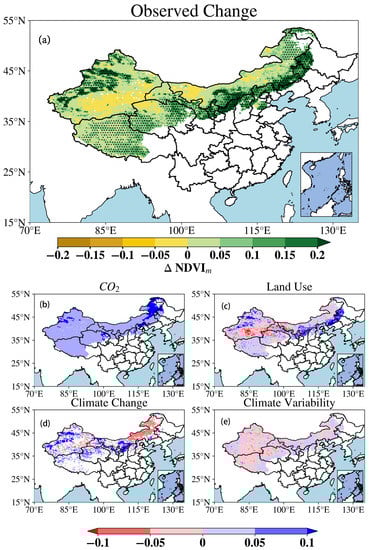 (a) Observed change of vegetation growth in Chinese dryland area. Yellow means decrease in NDVI and green means increase. Dotted areas suggest the change is significant ( = 0.10). Areas that have large uncertainties are masked in white. (b) The change of NDVI attributed to CO. (c) The change of NDVI attributed to LU. (d) The change of NDVI attributed to CC. (e) The change of NDVI attributed to CV.