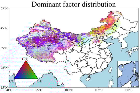 To investigate the dominant factors and synergistic effects of driving factors, we applied the ternary map of CO (red), LU (green) and CC (blue). It can be seen in the Figure 5 that northeast China is mainly dominated by CO fertilization effects. For the northwest, more regions are mainly controlled by CC. Many studies suggest that the northwest of China is undergoing a trend of wetter and warmer from the 1980s. Shi et al., (2002) found that the climate of arid regions in Northwest China are undergoing the shift from warm-dry to warm-wet. This research has aroused widespread concern [35]. Additionally, this change of climate is improving the environment of the northwest of China. Climate change has occurred longer than the 30 yr climatology and has influenced the ecological vegetation visibly [35]. Meanwhile, most color of the northwest is purple, which means CO also has non-negligible effects. LU (green) shows a main effect in the middle of Inner Mongolia.