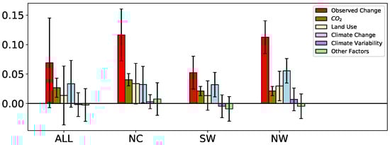 There are 9 members in each driving factor ensemble. We apply the IPCC protocol to determining ensemble significance and agreement. According the protocol, there are two disciplines: (1) more than 50% of ensembles members should pass the significant change ( = 0.10); and (2) Of all the model runs, over 80% must agree on the direction of change [27]. We show the dot sign on the area when the pixel fits the significant change. If a pixel fails to agree on the second discipline, the estimates of that component are masked.