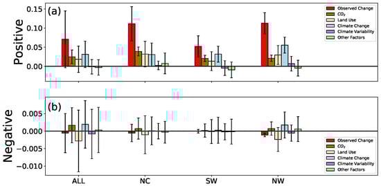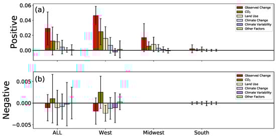 (a) The regional mean and magnitude (mean absolute value) of the different drivers of positive change in NDVI of American dryland areas. The error bars show the SD of grid cells. (b) The same as (a) for negative change.