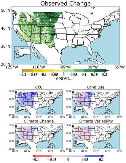 (a) Observed change of vegetation growth in American dryland area. Yellow means decrease in NDVI and green means increase. Dotted areas suggest the change is significant ( = 0.10). Areas that have large uncertainties are masked in white. (b) The change of NDVI attributed to CO. (c) The change of NDVI attributed to LU. (d) The change of NDVI attributed to CC. (e) The change of NDVI attributed to CV.