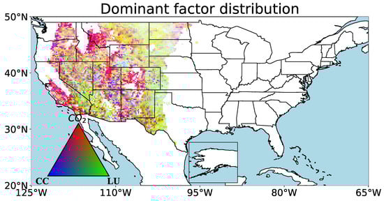 Map of three dominant factors’ distribution in American dryland areas. The areas controlled by CO are shown in red. The areas controlled by LU are shown in green. The areas controlled by CC are shown in blue.