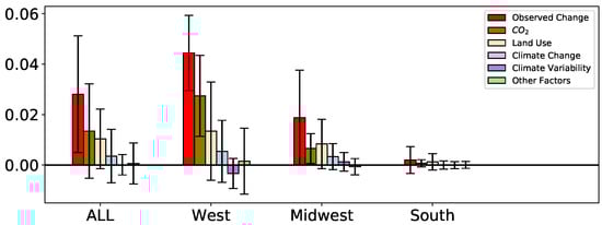 We separated the USA into four regions (West, Midwest, Northeast and South). The dryland areas are mainly located in West, Midwest and South (Figure 11). We regionally attributed the vegetation growth to different factors such as CO, CC, LU, CV and other factors our methods cannot attribute (Figure 12). For all American dryland areas, we found that CO is the dominant factor accounting for 47.9%. LU accounts for 36.8%. Among the dryland areas, the West shows the most significant positive trend. CO plays the most important role accounting for 61.7%, LU is 30.2%. It is notable that CV contributed negative effects on vegetation growth for 40 decades. For the Midwest, LU contributed the most on greening here, accounting for 44.6%. For the South, only a few areas are included in dryland and the observed change can be ignored.