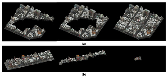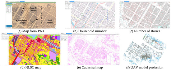 The cross-platform management tools consisted of software platforms using photogrammetry, GIS, drafting, and AR, and the hardware platforms were a UAV and a smartphone (Table 1 and Figure 3). Urban point cloud models were created and georeferenced by Zephyr® using UAV imagery (real-time kinematic, or RTK-enabled); one image was taken directly downwards at a 90° angle, and two images were taken sideways at a 45° angle. The point cloud model was allocated and georeferenced in CloudCompare®, so the models were correctly positioned in QGIS® at the location to be compared. The maps and point cloud models referred to the coordinate reference system (CRS) of Taiwan (EPSG:3857, WGS 84/pseudo-Mercator) and Keelung (EPSG:32651, WGS 84/UTM zone 51N). Floor numbers and configurations, which used to be hidden from UAV-based models, were illustrated using smartphone AR superimposed upon the current façade on a crossroad in the Augment® platform.