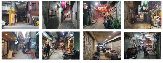 The observations, which confirmed the influence of the property axis and shape on the old fabric, were made through field visits (Figure 4), Google® Street View, and house visits. The field visits illustrated the images of the evolved block identity with regard to the entrances, building vocabulary, shop status, and business types. Google® Street View is a useful source of urban images that have a connection between the past and the present day. The street views enabled a historical check of the roof, façade partition, or alley entrance vocabulary. Moreover, the historical images also revealed the open or closed shop statuses, residents’ behavioral responses, entrance designs, utilities, and level of openness to the sky. The old alleys, which were usually made by the residential buildings, created block identities with their different business types, such as coffee shops, religious supplies, flower shops, convenience stores, music clubs, and hair salons. The alleys were narrowed down by weather shelters, heating ventilation and air conditioning (HVAC) facilities, or exhaust shafts with a zigzagged form of openness to the sky.