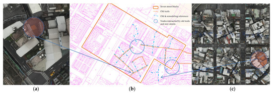 A city is usually defined by paths, edges, districts, nodes, and landmarks [45]. The old trails were developed in curves, which followed the original configuration of the old bay front. The new reform straightened the front into harbors and, consequently, developed grids parallel to the harbor front (Figure 1a). The adjustment of the old, curved trails and related block infill to the new grids inevitably curtailed the old trails, made them into discontinuous segments, and truncated the block perimeter into rectangles. The alleys were usually terminated by a viaduct, which was another factor altering the old fabrics.