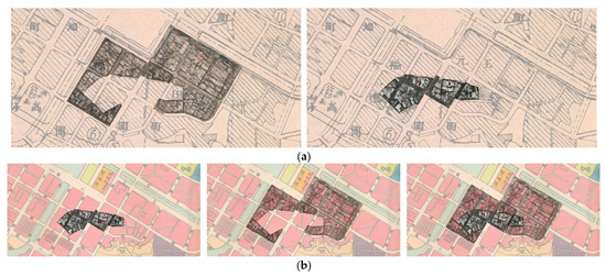 Figure 11. Different levels of tolerance and circulation, street partition, and offsetting by historical maps [1,43].