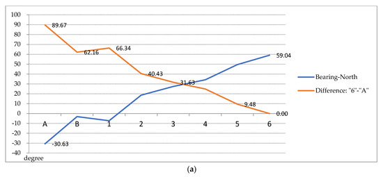 (a) The difference in bearing gradually varies from 89.67 degrees to 0.00 degrees; (b) the cadastral map-based illustration of axes; (c) the bearing measurement made in QGIS® for A-axis (A: Ching-An Temple).
