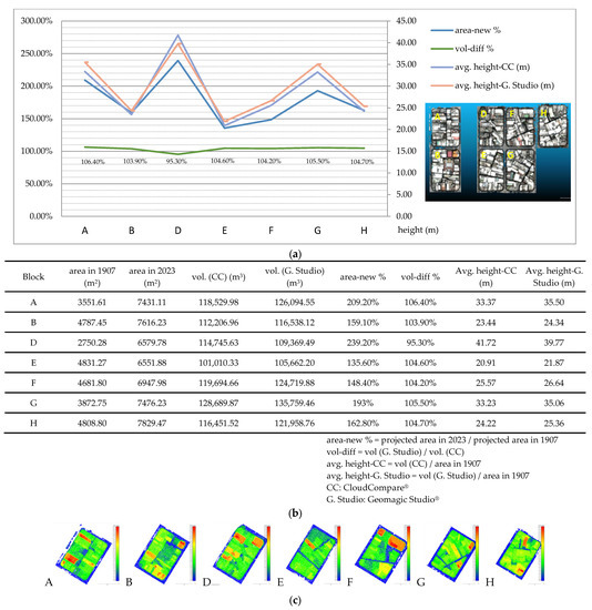 (a) The evolving area and volumetric percentages of seven street blocks; (b) the quantitative assessment; (c) elevation diagram created in CloudCompare® from volume calculation.