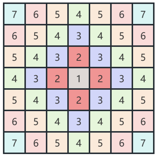 where denotes the coordinate of central position of the sample, that is the pixel to be classified. denotes the coordinates of other pixels in the sample. The visualization of SPE when the spatial size of the sample is can be seen in Figure 3. The pixel in the central position is unique and most important, and the other pixels are given different position encoding depending on the distance from the center.