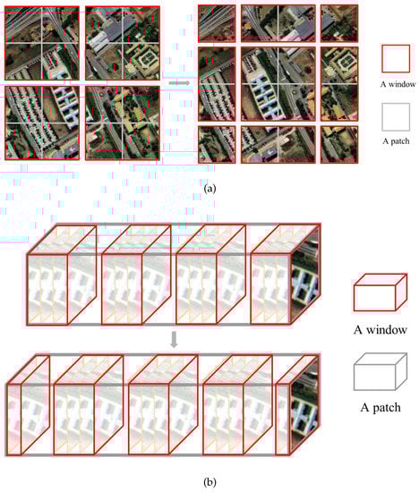 The structure of (a) S(W)-MSA of SwinT and (b) S-(S)W-MSA of SSWT (ours).