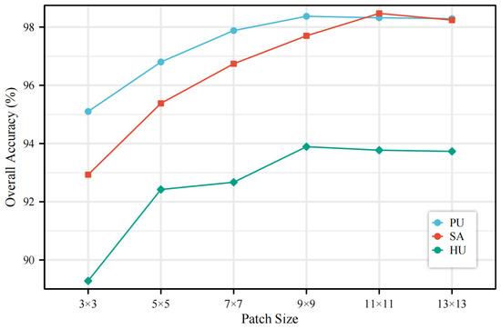 Patch size is the spatial size of the input patches, which determines the spatial information that the model can utilize when classifying HSIs. Therefore, The model’s performance is influenced by the patch size. A too large patch size will increase the computational burden of the model. In this section we compare a set of patch sizes to explore the effect of patch size on the model. The experimental results about patch size on the three datasets are shown in Figure 8. A similar trend was observed in all three datasets, OA first increased and then stabilized with increasing patch size. Specifically, the highest value of OA is achieved when the patch size is 9 in the PU and HU datasets, and the highest value of OA is achieved when the patch size is 11 in the SA dataset.