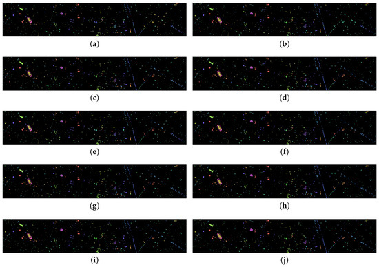 - Evaluation Indicators: To quantitatively analyse the efficacy of the suggested method and other methods for comparison, four quantitative evaluation indexes are introduced: overall accuracy (OA), average accuracy (AA), kappa coefficient (), and the classification accuracy of each class. A better classification effect is indicated by a higher value for each indicator.