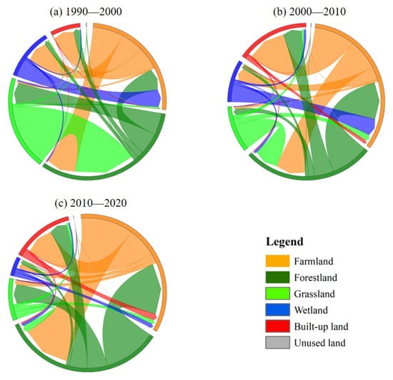Based on the Geo-information Tupu method, the land use transitions during the three periods (1990–2000, 2000–2010, and 2010–2020) were analyzed (Figure 4 and Table 3). The land use conversion areas were 122,424 ha, 374,721 ha, and 684,779 ha during 1990–2000, 2000–2010, and 2010–2020, respectively. From 1990 to 2000, forestland expansion was obvious, and “grassland to forestland” and “farmland to forestland” accounted for 28.72% and 14.06% of the changed land. Meanwhile, there were 12,257 ha and 12,182 ha of forestland converted to grassland and farmland, accounting for 10.01% and 9.95% of the total changed area. The built-up land expanded mainly by encroaching on farmland and forestland. There was 12,568 ha of farmland converted into wetlands during this period. During 2000–2010, farmland was mainly converted to built-up land and forestland, which accounted for 18.70%, and 14.15% of the changed area. Forestland was mainly converted to farmland and built-up land. Grassland was mainly converted to forestland, and wetland was mainly converted to farmland, which occupied 11.67% and 8.09% of the changed area. During 2010–2020, the transition from forestland to farmland occupied 24.28% of the changed area. Meanwhile, 163,130 ha of farmland was converted to forestland, accounting for 23.82% of the changed area. This was much higher than in the previous two periods. The built-up land mainly occupied farmland (93,059 ha) and forestland (56,380 ha). It is noteworthy that the area of “forestland to grassland” was much higher than that of “grassland to forestland” (62,716 ha vs. 23,469 ha). Conversion of “wetland to farmland” only accounted for 1.95% of the changed area, which was much lower than that during the previous two periods.