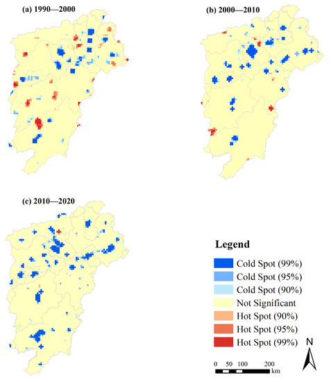 Hotspot analysis was conducted to analyze the spatial change in carbon storage (Figure 5). From 1990 to 2000, the hotspots of carbon storage change were mainly scattered across Shangrao, Jian, Pingxiang, and the southwest of Yichun. From 2000 to 2010, the area of hotspots of carbon storage change was less than in the previous period, and was mainly scattered throughout the south of Fuzhou, northeast of Nanchang, northwest of Jiujiang, and Guidong county of Hunan Province. From 2010 to 2020, the only hotspot of carbon storage change occurred in the southeast of Jiujiang. The cold spots of carbon storage change were mainly concentrated in urban regions and their surroundings during the three periods.