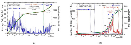 - The average active fire period (fire rate, 51.5 HSs day−1) from 10 September to 21 October (42 days) occurred at the end of the dry season or just before the rainy season (Figure 3). A high fire rate suggests the occurrence of deep peatland fires (DFPs).