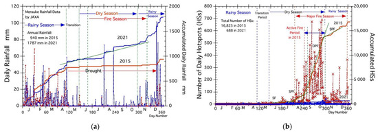 - Active fires in 2015 occurred under the long period of drought (about eight months (232 days) from late April) and strong drought conditions (total rainfall was about 58 mm (0.25 mm day−1)) due to El Niño (Figure 5a).