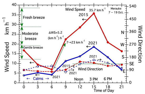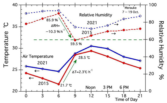 | Southern Papua (Merauke) | 2.3 (21.7) | −10.3 (85.9) | 5.2 (6.8) | ΔT = 1.4, ΔRH = −6.5, ΔWS = 2.4 (7–19 October 2021) | 6–9 a.m., 7–19 October 2015 |
