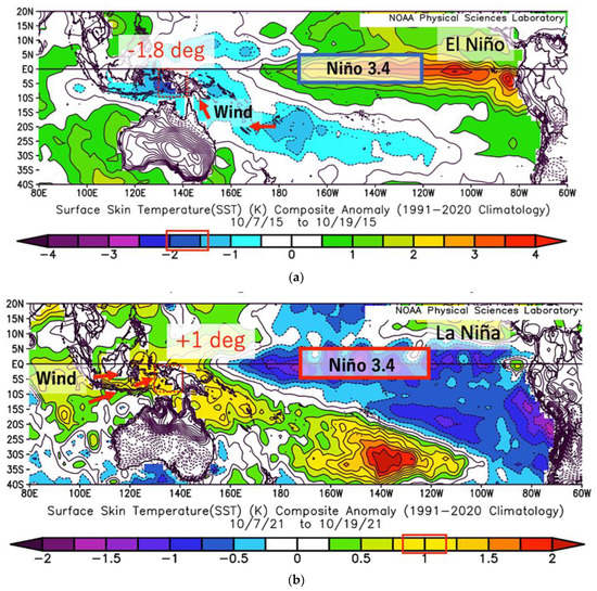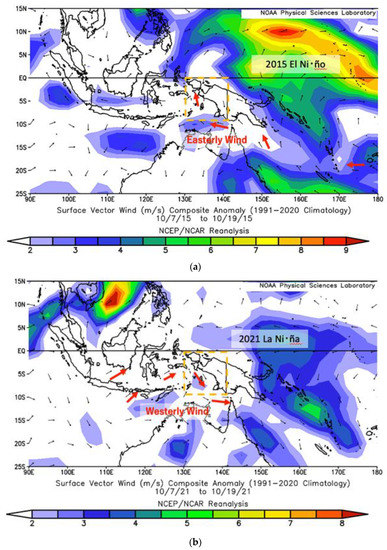 - We showed a relatively large difference in sea surface temperature anomaly (SSTA) in the Northern Arafura Sea between −1.8°K in 2015 and +1°K in 2021 (Figure 8).