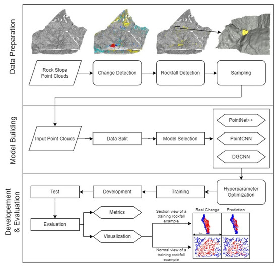 The raw rock slope point clouds are collected by terrestrial LiDAR scanning (TLS) in high resolution, generating large datasets (several gigabytes) monthly to seasonally. To generate the required inputs for the training of the DL models, the authors implement a three-step data preparation process, including: (a) change detection, (b) rockfall detection, and (c) sampling.