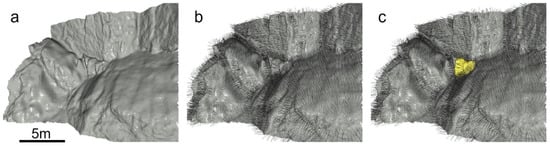 An example of the input to the proposed rockfall susceptibility approach where the local geometry has led to the failure of a wedge. (a) point cloud of the geometry prior to failure (enabling perception of position, distance, elevation, and size); (b) point cloud with normals overlain as black arrows (adds orientation perception to build understanding of the local structure, such as the surfaces that form the wedge); and (c) point cloud with normals and labeled wedge points in yellow (to create correlations between the local geometry and the target “object”).