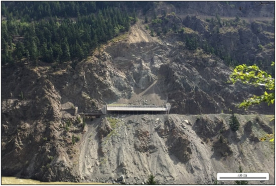 The CN Rail Ashcroft Mile 109.4 site (Figure 4), known as Mile 109, is an engineered rock slope located along the Frazer River in British Columbia, Canada. This rock slope is 240 m long, runs parallel to the CN track, and is approximately 65 m high. It is composed of successive layers of argillites, sandy siltstones, shales, sandstones, and conglomerates. Normal faults and shear zones cut the sedimentary layers along the slopes, creating favorable conditions for rockfalls. More details about the geologic setting and the failure patterns and mechanisms can be found in [30,35].
